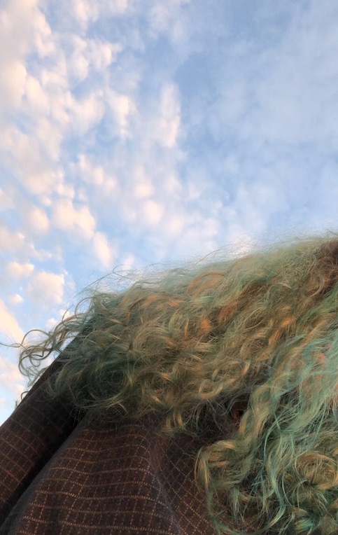 I watched the sun fall beneath the Hudson in ankle socks, bell bottoms, and a checkered polo from the men’s section at Saver’s, writing because nothing has made me more aware of my stereotypes than a head of blue curls. Feet out in an open field, nothing to hide behind, I listened to Frankie Cosmos, befriended a golden retriever, and